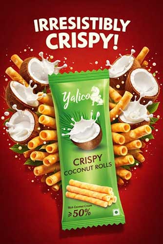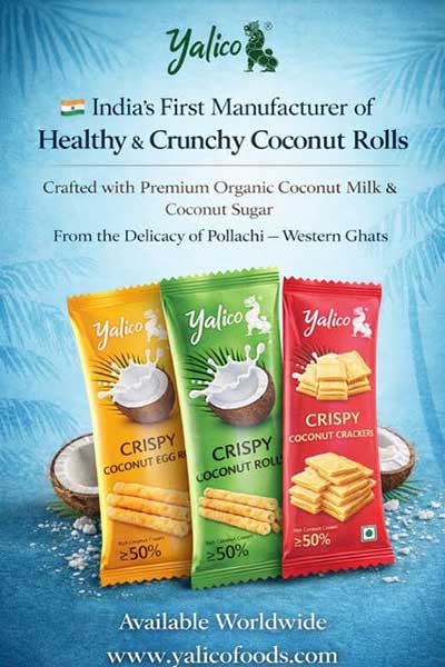 Yalico’s success with crispy coconut rolls has encouraged the company to bring out exciting new variants. Organic crispy coconut crackers, wafer twigs, crispy coconut pepper rolls, and coconut energy powder. Velayudham is constantly innovating but hasn’t lost sight of his original goal: to take the pride of Pollachi across the world.