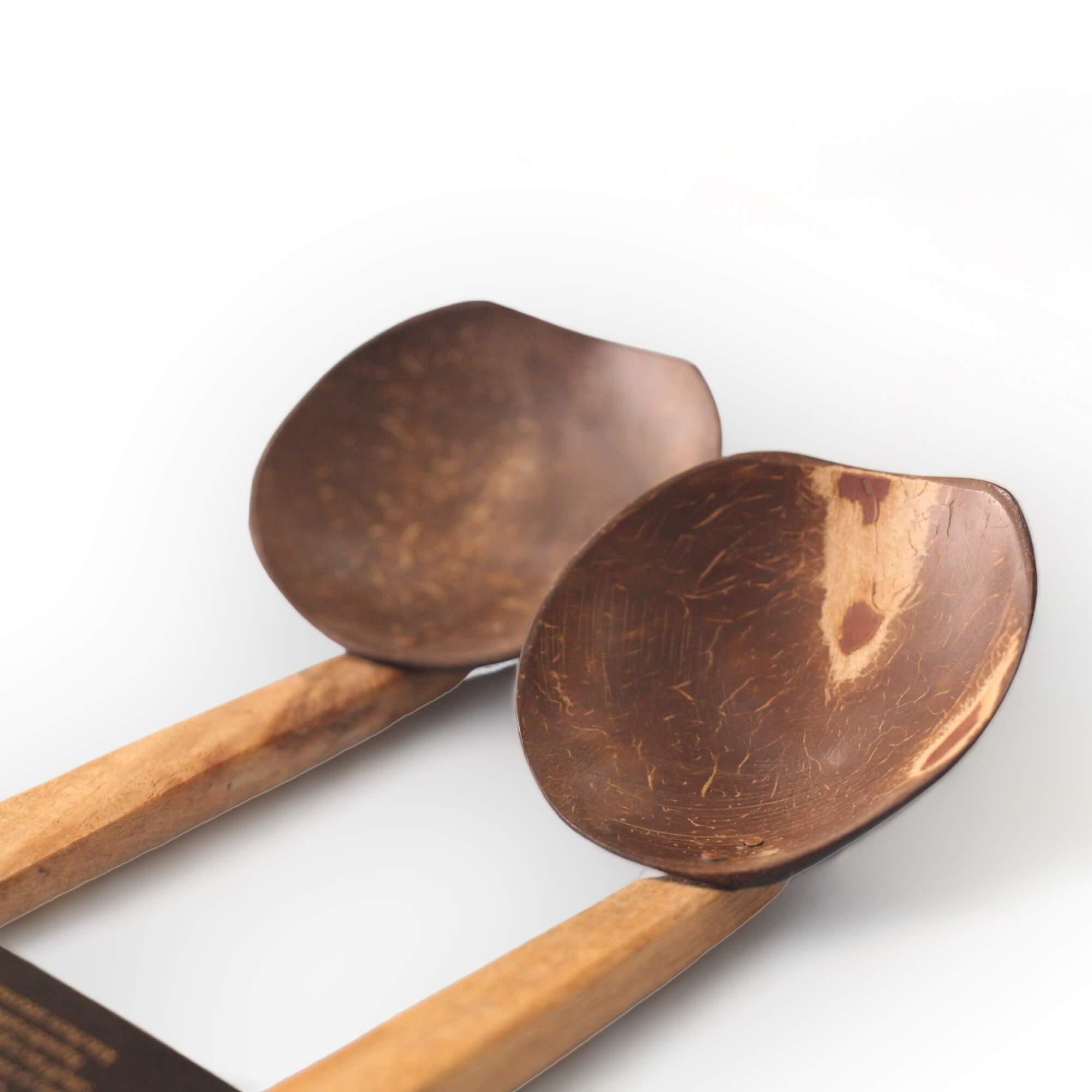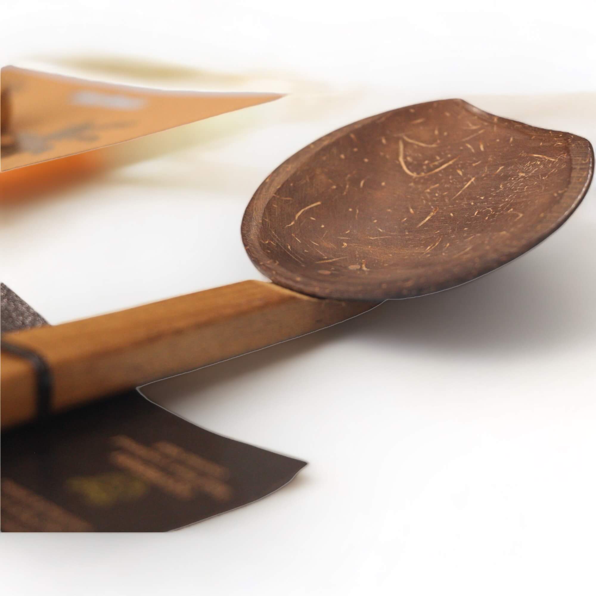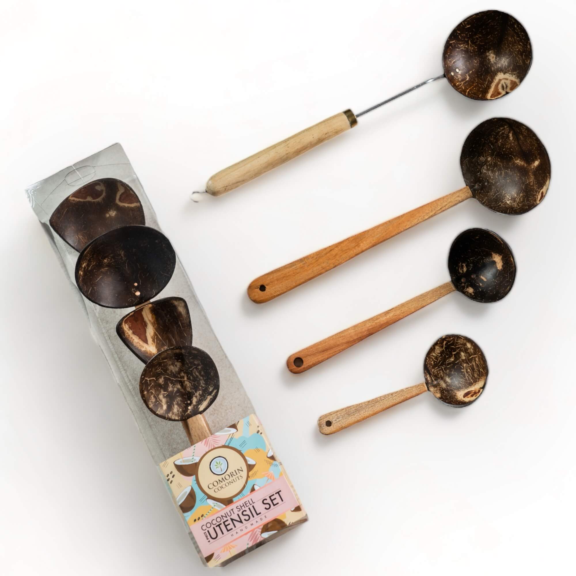 A 4-piece ladle set made from natural coconut shell. Includes a mix of sizes for different uses.