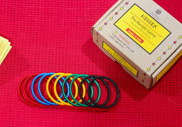 The game is played by tossing the bangles in the air and catching them on your fingers one by one.