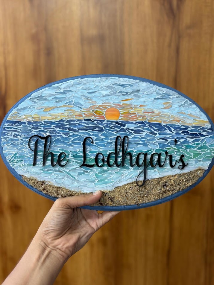 Name plate is made using hand cut stained glass on a backing of mdf board. The name is writen in acrylic. (Customizaton available) Size: H-8” W-12”