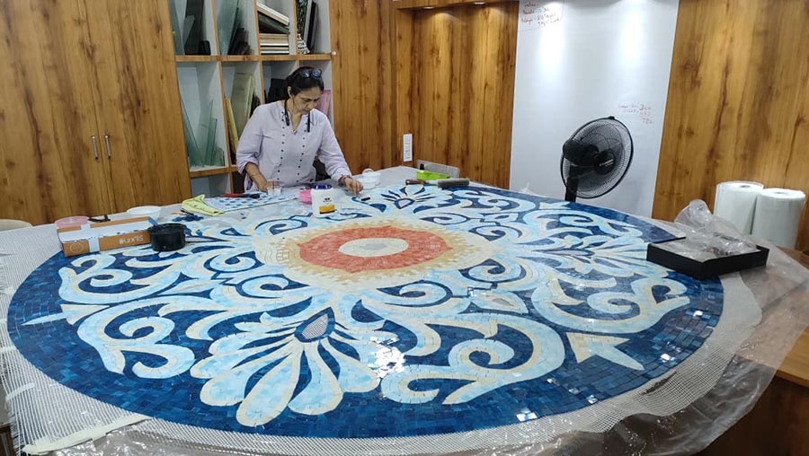 Aamena working on a big mosaic piece
