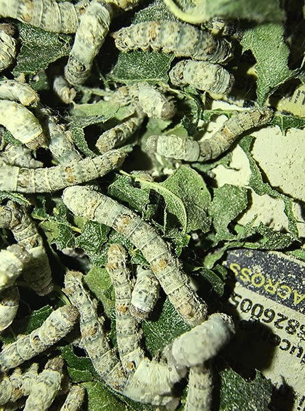 Mulberry trees grow in a specific kind of soil: they do not require pesticides, though the soil has to be fertile. The leaves on the shoots are harvested and taken to a special shed where the worms are housed. Receiving eggs from the government is contingent on the farmer owning at least an acre of land. The agencies hand out small worms and/or eggs on patches, which are placed in cubes inside these sheds. Once these eggs hatch, the worms begin to feed on bundles of mulberry leaves and grow rapidly in the next two weeks, when they are ready to spin their cocoons. These are then delivered to the auction centres, which are also run by the government.