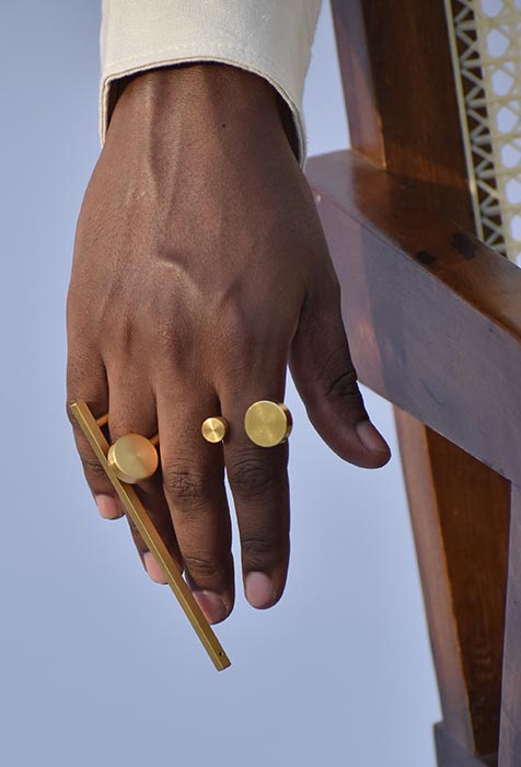 The choice of materials ultimately came down to costs and convenience. Brass is the main element of No Na Mé’s pieces, plated in gold. Smruti chose leather for its unconventionality. It’s rarely used in jewellery, but she hoped it would persuade men to wear it, which it did. The jewellery components are sourced from across India: wood from Tirunelveli, where the brand is based, leather and machined pieces from Mumbai, and handmade or cast pieces from Jaipur. She also uses stainless steel for its tensile strength.